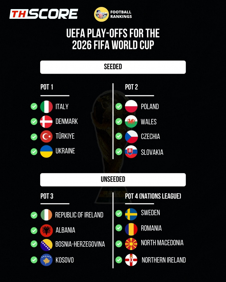 วันที่ 19 พฤศจิกายน – การแข่งขันฟุตบอลโลกรอบคัดเลือกโซนยุโรปได้เสร็จสิ้นลงเป็นที่เรียบร้อยแล้ว และได้มีการยืนยันการแบ่งโถสำหรับทีมที่จะเข้าสู่รอบเพลย์ออฟ (Play-offs) เพื่อช่วงชิงสิทธิ์ไปฟุตบอลโลกอย่างเป็นทางการ ดังนี้: